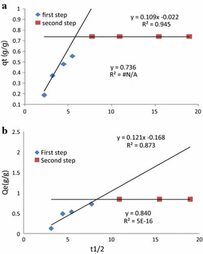 吸附機理粒子內(nèi)擴散模型用于確定總體吸附速率是否通過顆粒內(nèi)擴散來控制,即吸附物質(zhì)分子進入活性炭孔隙內(nèi)部。q t對t 1/2的曲線圖給出如圖3所示的線性關系 。截面(C)的值和斜率的粒子內(nèi)擴散速率常數(shù)(Kid)的計算值總結在表中。較大的截距值表明,與表面擴散相比,顆粒內(nèi)擴散具有較小的作用。該圖顯示在吸附過程中發(fā)生兩個步驟。急劇上升的部分是外表面吸附階段,而第二直線部分是逐漸吸附階段,其中顆粒內(nèi)或孔擴散是速率限制。急劇上升部分的高R 2值表明外表面吸附是速率限制步驟。線偏離原點和低R 2逐漸吸附階段的值表明,顆粒內(nèi)擴散不是唯一的限速步驟,因為早期報道了類似的結果。這意味著外表面的吸附或瞬時吸附階段發(fā)生,并且可以被用來描述吸附過程的機構。