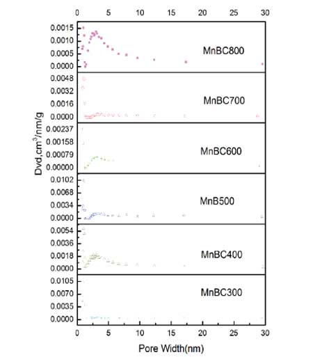 活性炭表面積和孔體積:活性炭的大部分孔徑分布在20和200之間,這表明碳主要是中孔(圖2)。表1顯示了碳化溫度和錳的顯著影響氯化物對孔隙發育和比表面積的影響。比表面積和孔體積隨著溫度從300℃升高到500℃而增加,在600℃時顯著下降,然后從600℃升高到800℃時再次增大。平均孔徑與表面積和孔體積呈相反的變化規律。出乎意料的是,高碳化溫度下的平均孔徑呈現出與以前研究不同的變化趨勢:孔徑不增加,反而下降。通常,活性炭的孔徑分布取決于活化溫度,原料和保留時間。在一定溫度范圍內增加碳化溫度增加了前體中揮發性物質的演變,使得孔隙發育的益處和創造新的孔隙。的熱解作用,當超出該范圍時,會造成微孔的崩潰和微孔的寬顯著量中孔,質量只是下降。高熱解溫度下的異常變化趨勢表明,活化劑必須在生物炭的孔結構和比表面積上有所不同。
