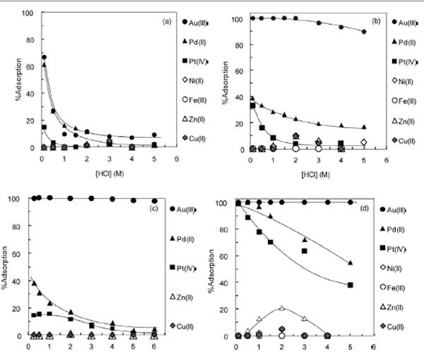 在酸性氯化物介質中,Au(III),Pd(II)和Pt(IV)分別生成穩定的陰離子氯化物配合物,如AuCl 4 -,PdCl 4 2-和PtCl 6 2-,而大部分堿Ni(II),Zn(II)和Cu(II)等金屬離子以陽離子或中性形式存在,陰離子氯絡合物的濃度只有在Fe(III)情況下氯離子濃度較高時才有意義。圖3a-3d顯示了在不同的HCl濃度下,一些貴金屬和堿金屬離子在微藻殘余物,活性炭上的吸附%。
