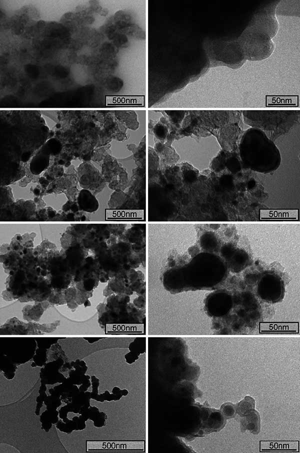 圖1、透射電子顯微鏡(TEM):真空退火前的活性炭納米級零價鐵(上圖), 在600℃真空退火4小時(從頂部開始第二個)后;,活性炭真空退火后。