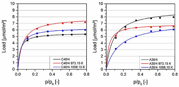 圖2顯示極性溶劑丙酮在25攝氏度的吸附等溫線(xiàn)。未涂覆的活性炭A35/4與活性炭C40/4相比的負(fù)載顯著較高。兩種碳都是由相同的原料制造的,但活性炭A35/4在水蒸氣氣氛中經(jīng)過(guò)較長(zhǎng)時(shí)間的活化。由于原始生產(chǎn)過(guò)程中氧化條件下活化時(shí)間較長(zhǎng),活性炭A35/4具有較高的極性表面基團(tuán)數(shù)量,有利于極性丙酮的吸附。在700攝氏度下涂覆的樣品的負(fù)載對(duì)于兩種類(lèi)型的活性炭具有相同的數(shù)量級(jí),因?yàn)橛捎趦?nèi)部孔系統(tǒng)的涂覆,表面特性的差異減小,并且表面化學(xué)的相關(guān)修改。2涂層和極性丙酮,極性活性炭A35/4上的負(fù)載僅略有變化。在820攝氏度下涂覆的樣品也具有可比較的負(fù)載。由于非極性SiC涂層和由此導(dǎo)致的較弱的相互作用,負(fù)載低于在700攝氏度下涂覆的樣品的負(fù)載。