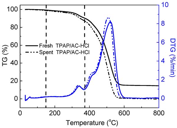 如圖2所示,通過TGA研究了廢催化劑的焦炭沉積。以TPAP/活性炭-HCl為例,不僅新鮮的TPAP/活性炭-HCl催化劑在150℃以前因在催化劑表面發(fā)生水解或小分子解吸而出現(xiàn)輕微的質(zhì)量損失。在150-385℃的范圍內(nèi),新鮮催化劑和廢催化劑均有緩慢的質(zhì)量損失。然而,當(dāng)溫度超過385℃時(shí),由于載體的燃燒,催化劑質(zhì)量損失快??紤]到這一點(diǎn)的活性炭本身會(huì)失去它的重量在空氣氣氛中,以產(chǎn)生CO 2,在150-385℃的范圍內(nèi)的質(zhì)量損失反映了花費(fèi)TPAP/活性炭-鹽酸催化劑上的焦炭沉積量。