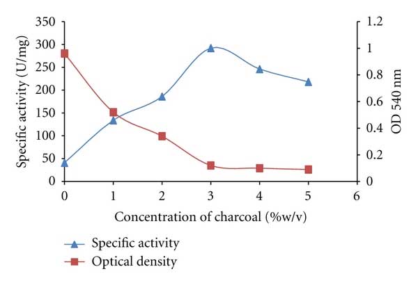 圖1中顯示的結果顯示了各種濃度的活性炭對純化真菌淀粉酶的影響。 當活性炭濃度增加到3%w/v時,葡糖淀粉酶的比活性顯著增加,最適比活性為250U/mg。 進一步增加超過3%(w/v)導致其具體活動減少。在處理的樣品中觀察到約90%的濁度降低。 據觀察,隨著所用木炭量的增加,吸收速率在數量上變化。據報道吸附程度受吸附劑對吸附劑的可及性的影響。