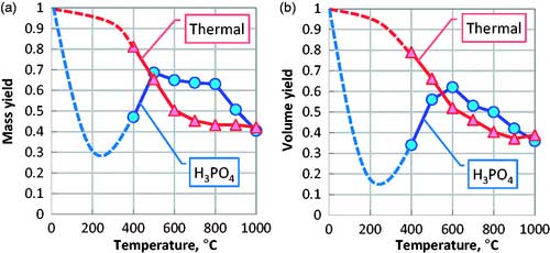 圖1.質量(a)和體積(b)碳化過程中聚酰亞胺共聚物在有和沒有磷酸的情況下變成活性炭。