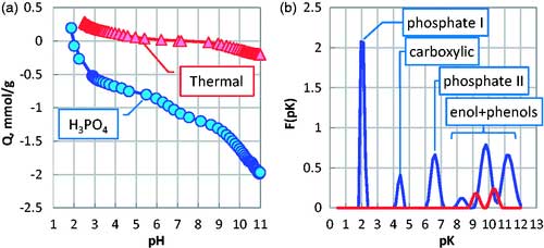 磷酸活化的活性炭有豐富表面官能團由電位滴定法證明。質子結合等溫線表明,無磷酸熱處理得到的活性炭在pH約為7時具有PZC中性表面,并含有非常少量的表面基團(圖4(a))。相反,通過磷酸活化獲得的活性炭在酸性表面基團的高濃度下在約pH 2下顯示具有PZC的酸性表??面。酸性表面基團的計算分布顯示磷酸基團的存在顯然源于磷酸、 羧酸基團、磷酸酯基,烯醇和酚基的第二解離常數(圖3(b))。