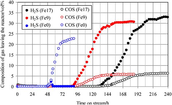圖1. 350°C時的突破曲線(原料氣體:CO:41.0體積%,H 2:28.1體積%,CH 4:4.2體積%,CO 2:0.4體積%,C 2 H 4:0.1體積%,N 2:26.3體積%,H 2 S:20ppmv,COS:20ppmv),SV(350℃)= 1592h -1。Fe含量為9wt%和17wt%的兩種Fe負載活性炭樣品由Fe9和Fe17表示。