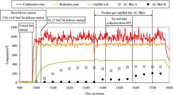 圖2. 氣化爐和活性炭過濾器的溫度隨時間的變化。