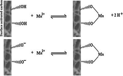 制備的活性炭表面含有氧和芳族化合物的官能團(tuán)。這些團(tuán)體可以參與化學(xué)鍵合,負(fù)責(zé)活性炭的陽(yáng)離子交換能力。因此,活性炭/錳反應(yīng)可以用兩種方式表示(圖2)。根據(jù)此圖,離子交換的可能機(jī)制可以被認(rèn)為是一個(gè)錳離子(Mn2 +),其自身附著在兩個(gè)相鄰的羥基和雙氧基上,可以將兩對(duì)電子給予金屬離子,形成四個(gè)配位數(shù)化合物并將兩個(gè)氫離子釋放到溶液中。